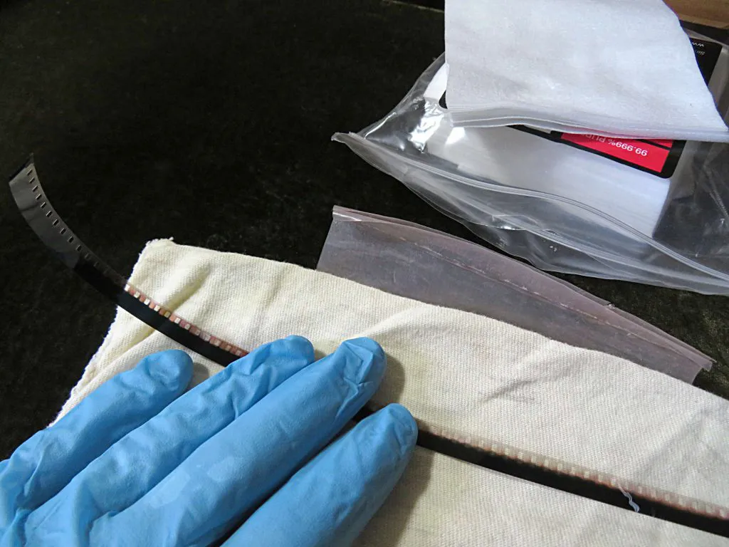 Nei nostri 13 anni di esperienza, abbiamo notato che tutti i film traggono vantaggio dalla pulizia, anche quelli appena usciti dal laboratorio! Molti film non richiedono cure particolari, una pulizia a mano accurata è sufficiente. Altri film, seppur rari, richiedono una soluzione costosa per film chiamata “FilmRenew” (non mostrata qui).